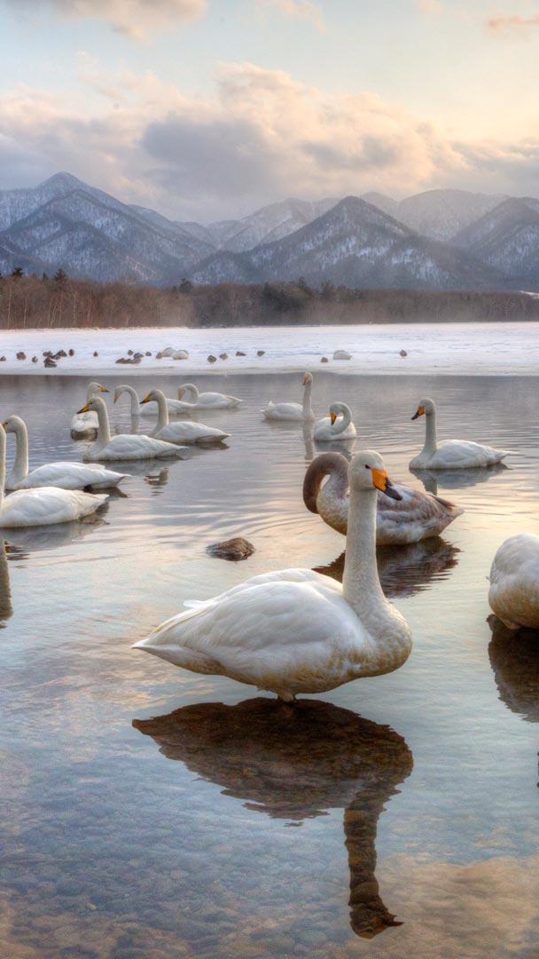 An elegant creature for a majestic setting. These all-white birds with yellow-and-black bills, gliding on the mirror of Lake Kussharo in Japan, are whooper swans—the Eurasian equivalent to the North American trumpeter swans. Named for their loud "whooping" call, these beauties, with a wingspan between 2 to 3 metres, are one of the world"s heaviest birds that are able to fly. While whooper swans are Finland"s national bird, they only spend their breeding season there. Those swans, as well as others in various northern areas migrate to warmer, often coastal areas when cold weather sets in. All that travel doesn"t ruin their relationships—these waterfowl form strong, monogamous pairs that can last for life.