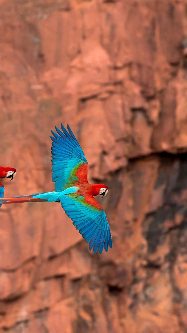 Today"s image features red-and-green macaws at Buraco das Araras, in the state of Mato Grosso do Sul in Brazil. In this sanctuary, their vibrant red and green plumage with wings can reach over 90 centimetres. Their wings shine brightly against the expansive blue Brazilian sky and its impressive backdrop of towering red sandstone walls. Being one of the largest macaw species, they play a crucial role in dispersing seeds in their habitat, helping the regeneration of vegetation. Embark on a journey to Buraco das Araras and witness the graceful flight of these birds, a testament to the mesmerising beauty that our world so generously bestows. Spread your imaginary wings, and let us peek at these feathered creatures, shall we?