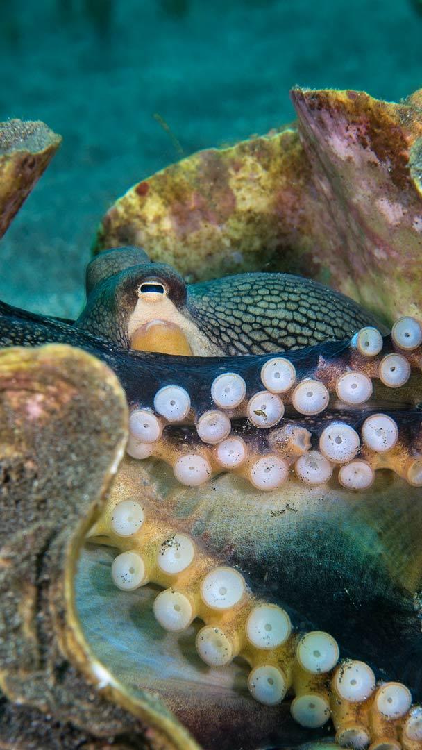Don"t blame yourself if you are not sure what you are looking at. The veined octopus, also known as the coconut octopus, is one of the smartest animals on Earth and has an exceptional talent for building deceptive shelter from seashells and coconut shells. If you peek inside, you may notice some arms covered with circular suction cups; octopuses have eight of these limbs, which is where their name originates from. "Októpus" is a Greek word, meaning "eight footed". The arms, lined with suckers, have clusters of neurons in them, which make them particularly sensitive. Each arm—attached to the conical head—can be used separately, allowing the octopus to solve often complex tasks. Octopuses can match the colour—sometimes even the texture—of their environment, which might be another reason why you don"t spot them easily.