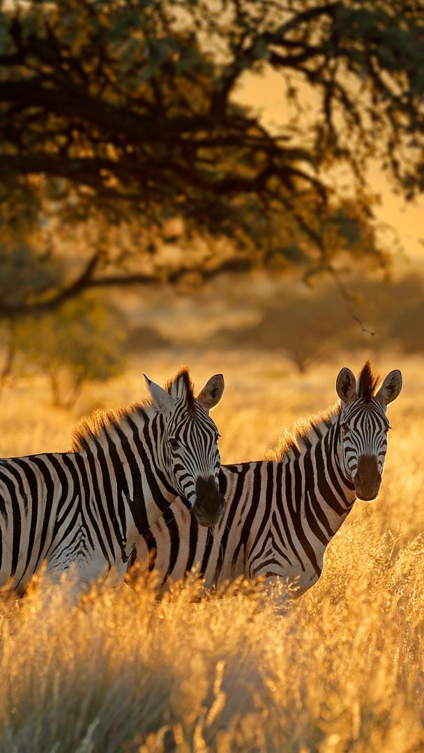 In today"s picture, we see two plains zebras—which are anything but plain—standing gracefully at sunrise in Mokala National Park, South Africa. These striking animals, known for their unique black and white patterns, are mostly found in the African savannah, stretching from Kenya to South Africa. These stripes aren"t just for show—they act as camouflage against predators by disrupting the outline of individual zebras within a herd. When it comes to food, they are not fuddy. Grass is their main dish, but they"ll munch on leaves and barks if that"s what"s on the menu. They have a tough digestive system that lets them make the most of whatever they find, even if it"s not the freshest. Plains zebras live in family groups, usually led by a dominant stallion, with mares and their foals forming the core of the herd.