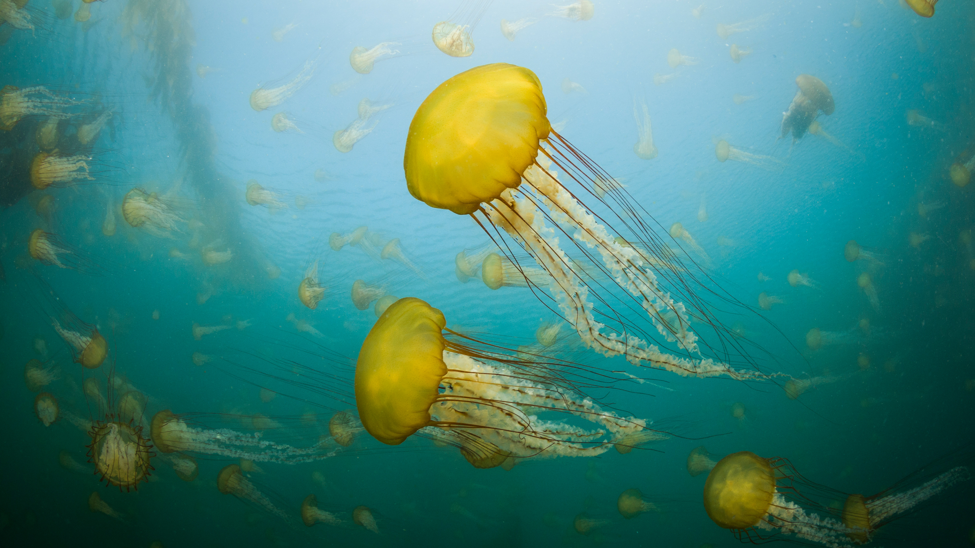 Jellyfish may be observed in all the world"s oceans in an array of shapes and sizes. There are about 2,000 different species of jellyfish, and they all lack hearts, bones and brains. Pacific sea nettle jellyfish, seen here, are known for their vibrant golden-brown bell, long tentacles and inhabit the coastal waters of California and Oregon. Moon jellyfish are pale and have short tentacles, and in an unexpected but somewhat appropriate twist, they ventured into space aboard the space shuttle Columbia in 1991 to help scientists study their unique biology. No matter the species, jellyfish play a vital role in the ocean"s food chain, as they are the primary food source for many seawater animals, including sea turtles. Jellies are threatened by climate changes, marine pollution and overfishing, and damage to their populations has reverberating effects on the sea life that depends on them.