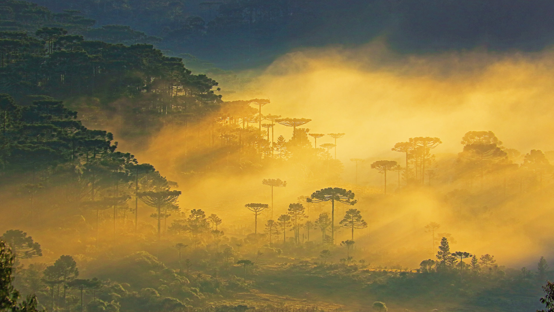 Uma neblina misteriosa Pinheiros de araucária em um amanhecer enevoado, paisagem próxima a Gramado, Rio Grande do Sul (© iStock/Getty Images Plus/Getty Images)