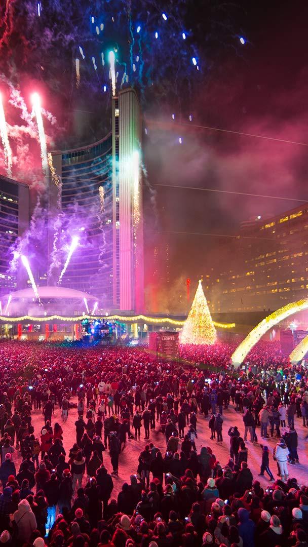 And so it begins! People watch the Christmas lights and fireworks at the Nathan Phillips Square in Toronto on November 30, 2013 (© Canadapanda/Shutterstock)