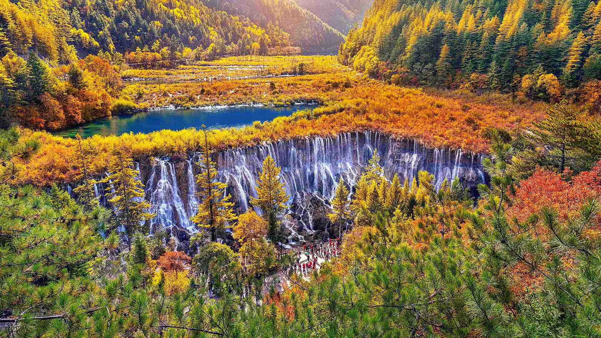 彩林叠翠间的瀑布 秋季九寨沟国家公园里的诺日朗瀑布, 四川省, 中国 (© tawatchaiprakobkit/Getty images)