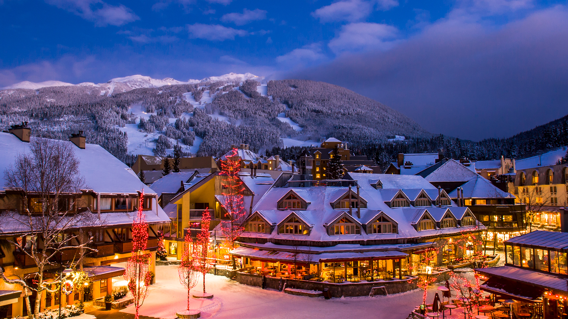 灯光点亮了悠闲的小镇 黑梳山附近的惠斯勒小镇,加拿大不列颠哥伦比亚省 (© VisualCommunications/Getty Images)