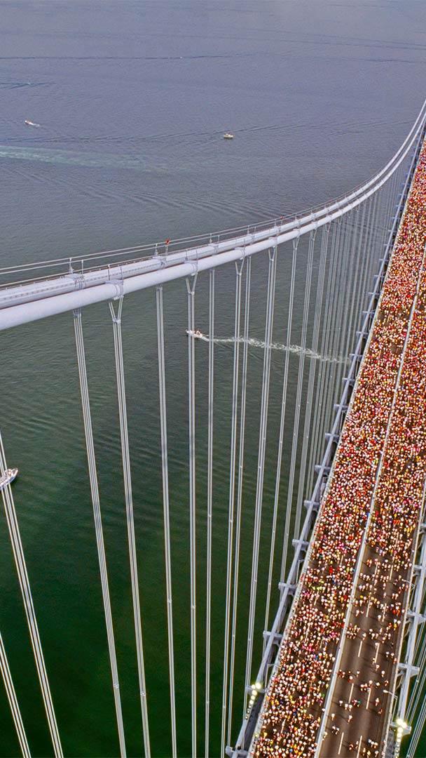 跑过纽约五个行政区 1990年纽约市马拉松比赛,参赛者穿过韦拉扎诺海峡大桥 (© David Madison/Getty Images)