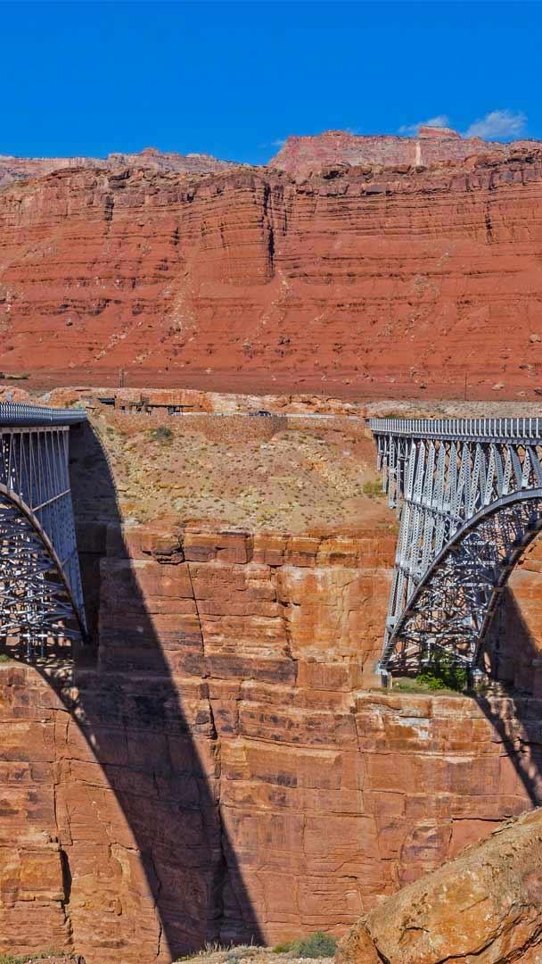 横跨峡谷裂缝的两座桥 大理石峡谷中横跨科罗拉多河的纳瓦霍桥,美国亚利桑那州北部 (© trekandshoot/Alamy)