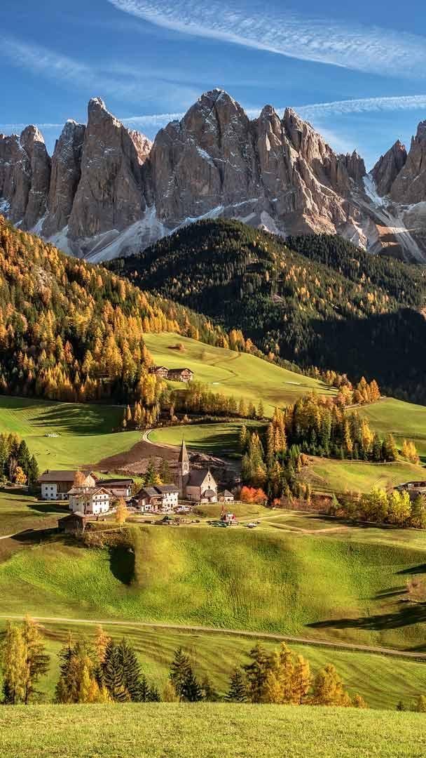 如诗如画的地方 富内斯山谷,背景是多洛米蒂山,南蒂罗尔,意大利 (© Achim Thomae/Getty Images)