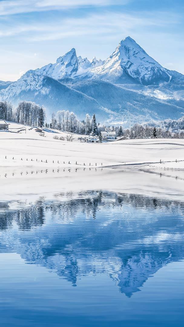 Die klare Winterluft liegt über der verschneiten Berglandschaft der Alpen, die majestätischen Gipfel spiegeln sich im glatten Spiegel des zugefrorenen Sees. Die verschneiten Bäume ringsum zeugen von einer harmonischen Stille und Ruhe, die nur durch das leise Knirschen des Schnees unter den Schritten unterbrochen wird. Die Sonne wirft ihre Strahlen auf die Landschaft und den See, lässt uns innehalten und Wohlbefinden spüren.