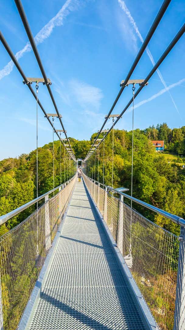 Erleben Sie einen Nervenkitzel der besonderen Art auf einer der längsten Fußgängerhängebrücken der Welt - der Titan RT an der Rappbodetalsperre im sagenumwobenen Harz. Schwebend über dem beeindruckenden Rappbodetal verbindet das 483 Meter lange architektonische Meisterwerk die steilen Felswände des Nationalparks und bietet einen atemberaubenden Ausblick, den sonst nur Vögel genießen können. Spüren Sie das leichte Schwanken unter Ihren Füßen und den Wind, der die Kraft der Natur spürbar macht.