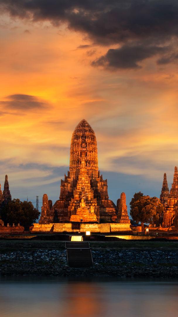 Cuando la puesta de sol hechiza Tailandia, el templo budista Wat Chaiwatthanaram se ilumina para dar la bienvenida a la noche en el Parque Histórico de Ayutthaya. Aunque el templo no forma parte de la cercana Ciudad Histórica de Ayutthaya (Patrimonio de la Humanidad de la UNESCO), la ruina es igual de sagrada y exhibe meticulosos detalles de rica historia y arquitectura. El rey Prasat Thong, de la dinastía del reino siamés de Ayutthaya que gobernó el sudeste asiático entre los siglos XIV y XVIII, construyó el santuario para simbolizar el centro del universo y connotar su aspiración a convertirse en el futuro Buda. Desde el templo budista se puede llegar a la ciudad histórica de Ayutthaya en barco o por carretera. Tres ríos unen la que fue ciudad metropolitana del Reino de Siam con el mar. Convertida hoy en ruinas históricas, Ayutthaya fue un importante punto de comercio y diplomacia, con las ventajas de los ríos que la rodean como defensa natural.