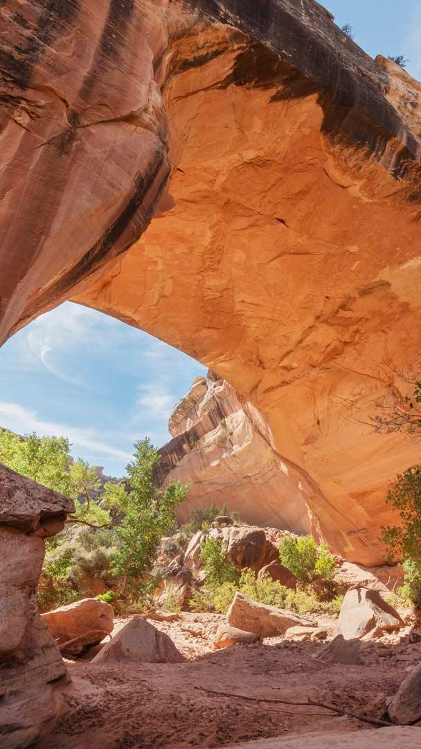 En los remotos cañones del sureste de Utah, en Estados Unidos, el Monumento Nacional de los Puentes Naturales revela la fuerza de la erosión y el paso del tiempo. Moldeado por el viento y el agua, alberga tres impresionantes puentes naturales: Sipapu, Kachina y Owachomo. Estos puentes reciben sus nombres en honor a los Pueblo Ancestrales que habitaron la región. Sipapu, el más grande, tiene una abertura tan extensa que podría albergar la cúpula de la Sagrada Familia en Barcelona. Kachina, visible en la foto, está situado entre Sipapu y Owachomo. Su nombre proviene de los petroglifos y pictografías que adornan su base. Owachomo es el más antiguo y su estructura delgada y arqueada podría colapsar con el tiempo.