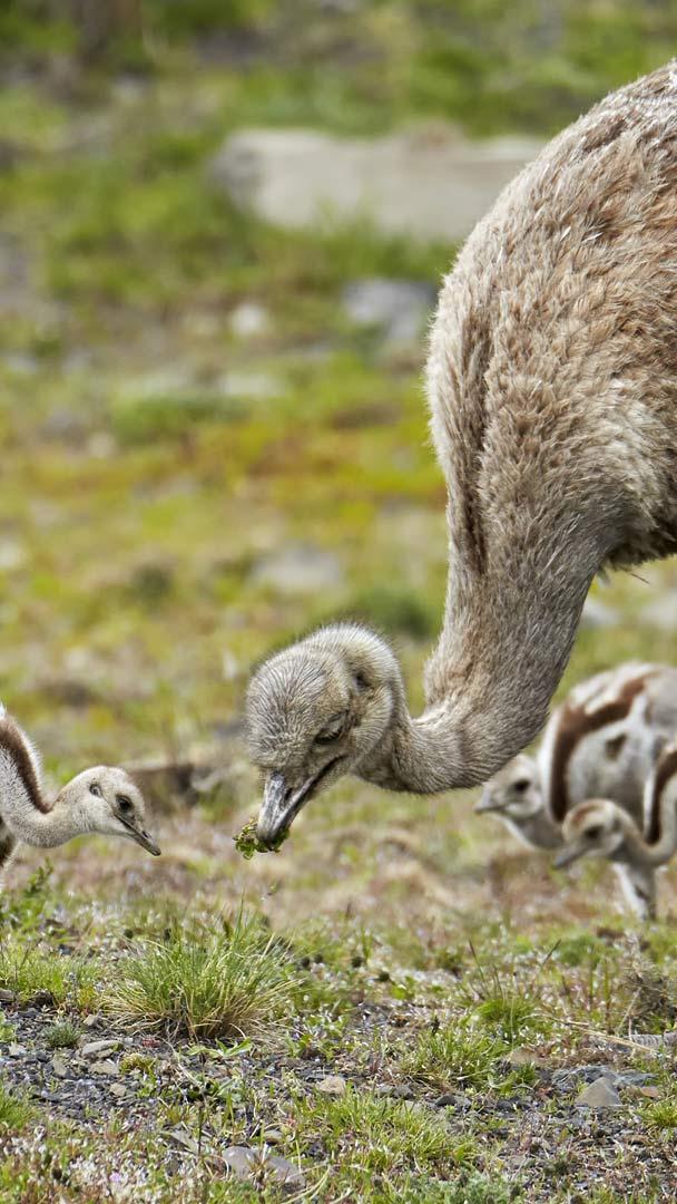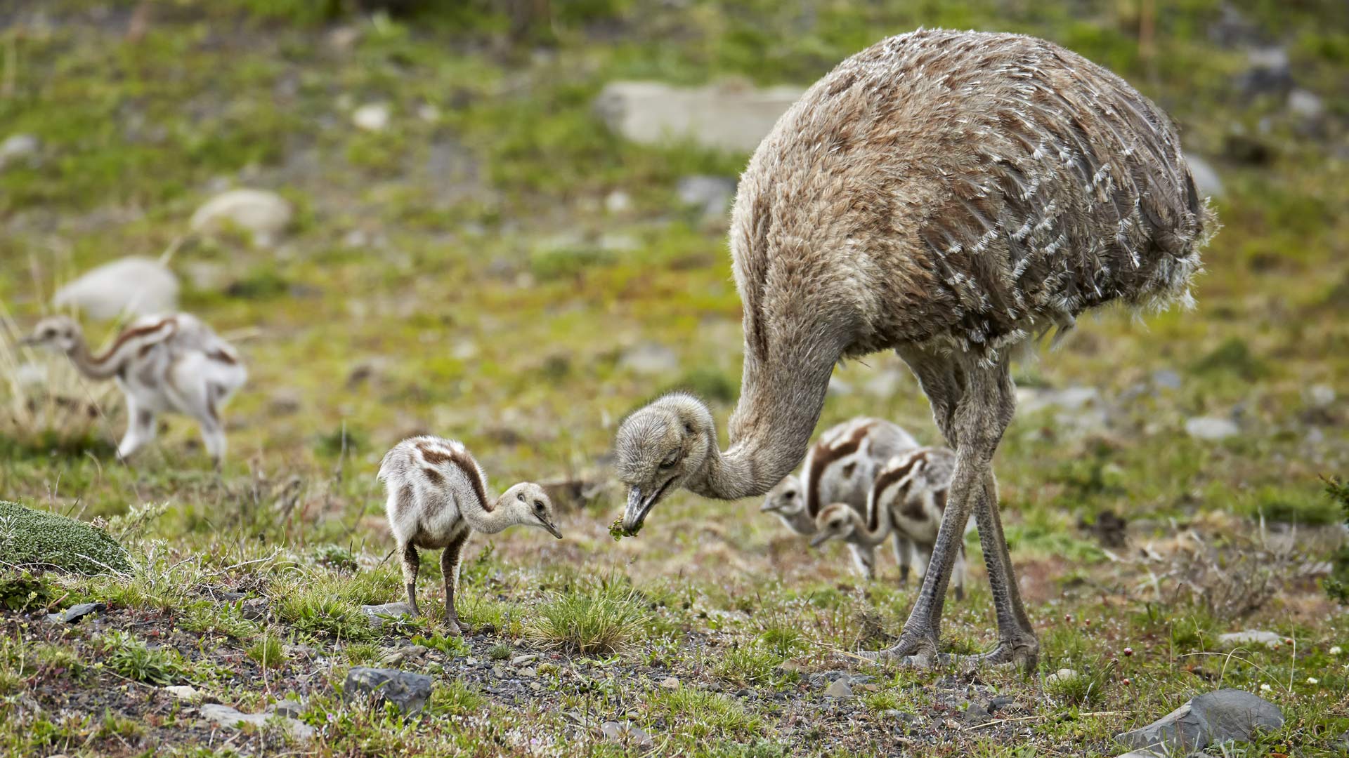 En la imagen de hoy vemos a un ñandú macho, también llamado ñandú de Darwin, junto a sus polluelos en el Parque Nacional Torres del Paine, en la Patagonia chilena. Esta ave no voladora, emparentada con los avestruces, es todo un ejemplo de paternidad en la naturaleza.