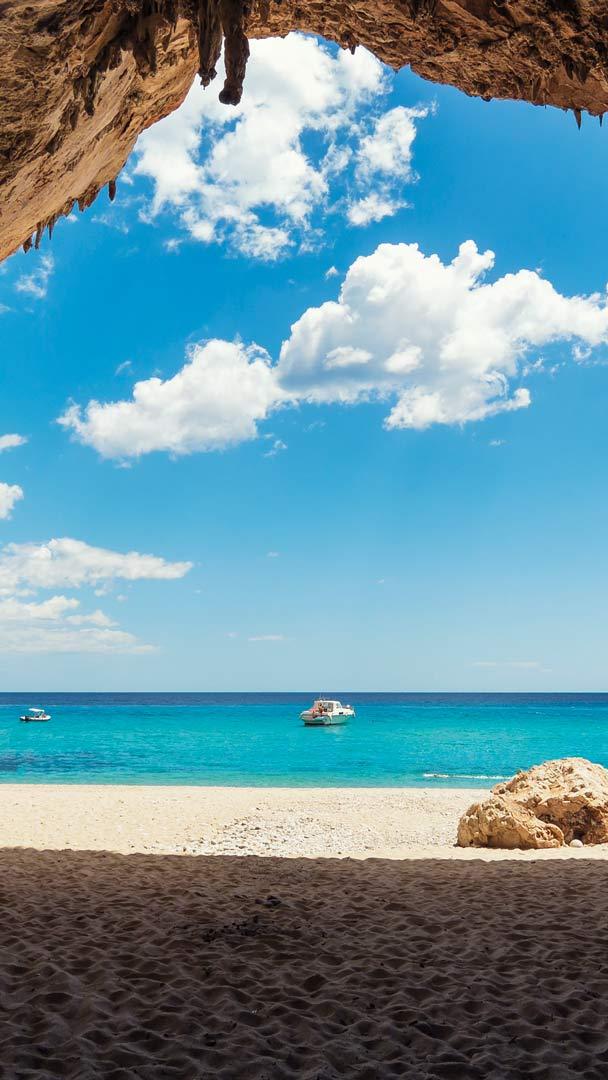 Estamos en Cala Luna, una joya del golfo de Orosei, en la costa oriental de Cerdeña, Italia, bañado por el mar Tirreno. Aquí, la naturaleza ha esculpido cuevas en la roca que se abren al mar, creando rincones íntimos donde el agua transparente entra suavemente y refleja la luz sobre las paredes de piedra caliza.