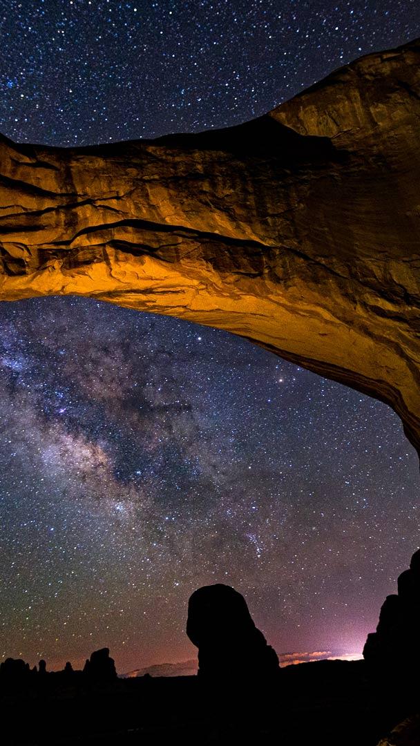 Sous l’arche monumentale de Double Arch, la Voie lactée déploie son éclat ancestral. Nichée au cœur du parc national des Arches, dans l’Utah aux États-Unis, cette formation géologique spectaculaire témoigne de plus de 150 millions d’années d’érosion. Sculptée par le vent et l’eau, la roche encadre ici le ciel étoilé avec une majesté presque solennelle. Ce cliché, capturé depuis le désert du Colorado, révèle l’un des panoramas nocturnes les plus purs au monde. Le parc bénéficie du label « Dark Sky Park », distinction rare accordée aux sites où l’obscurité naturelle est soigneusement préservée.