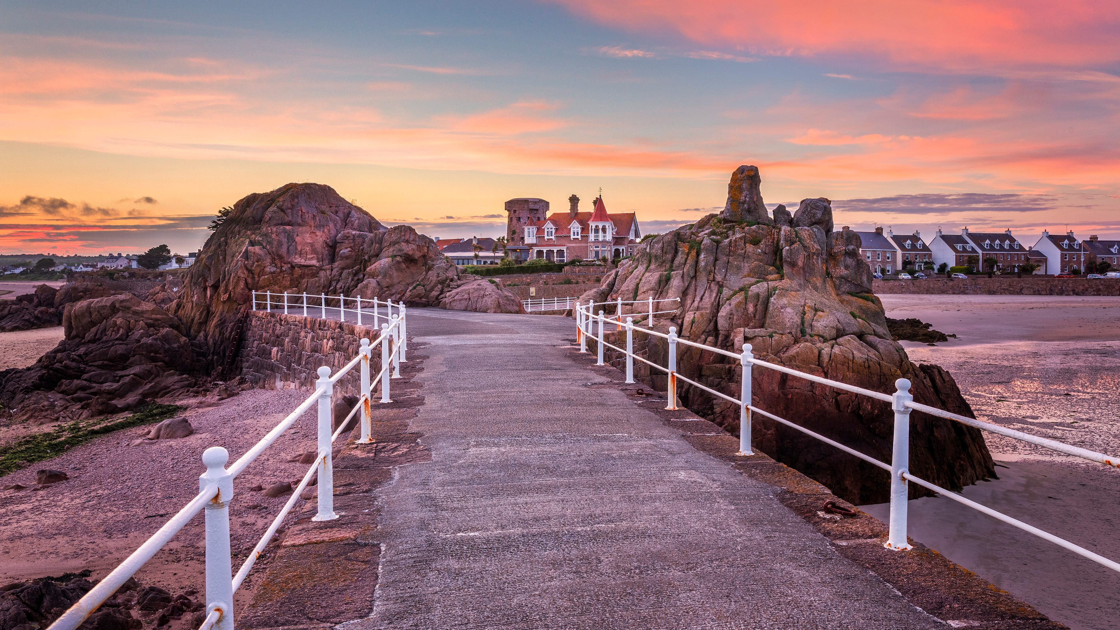 Explorez Jersey, l"île aux charmes nordiques nichée au large de la Normandie. Le port pittoresque de La Rocque offre un spectacle divin : une plage de sable blanc bordée d"une passerelle plongeant dans l"eau. Ces côtes témoignent de plus de 420 millions d"années d"histoire à travers des roches aux couleurs et textures étonnantes.