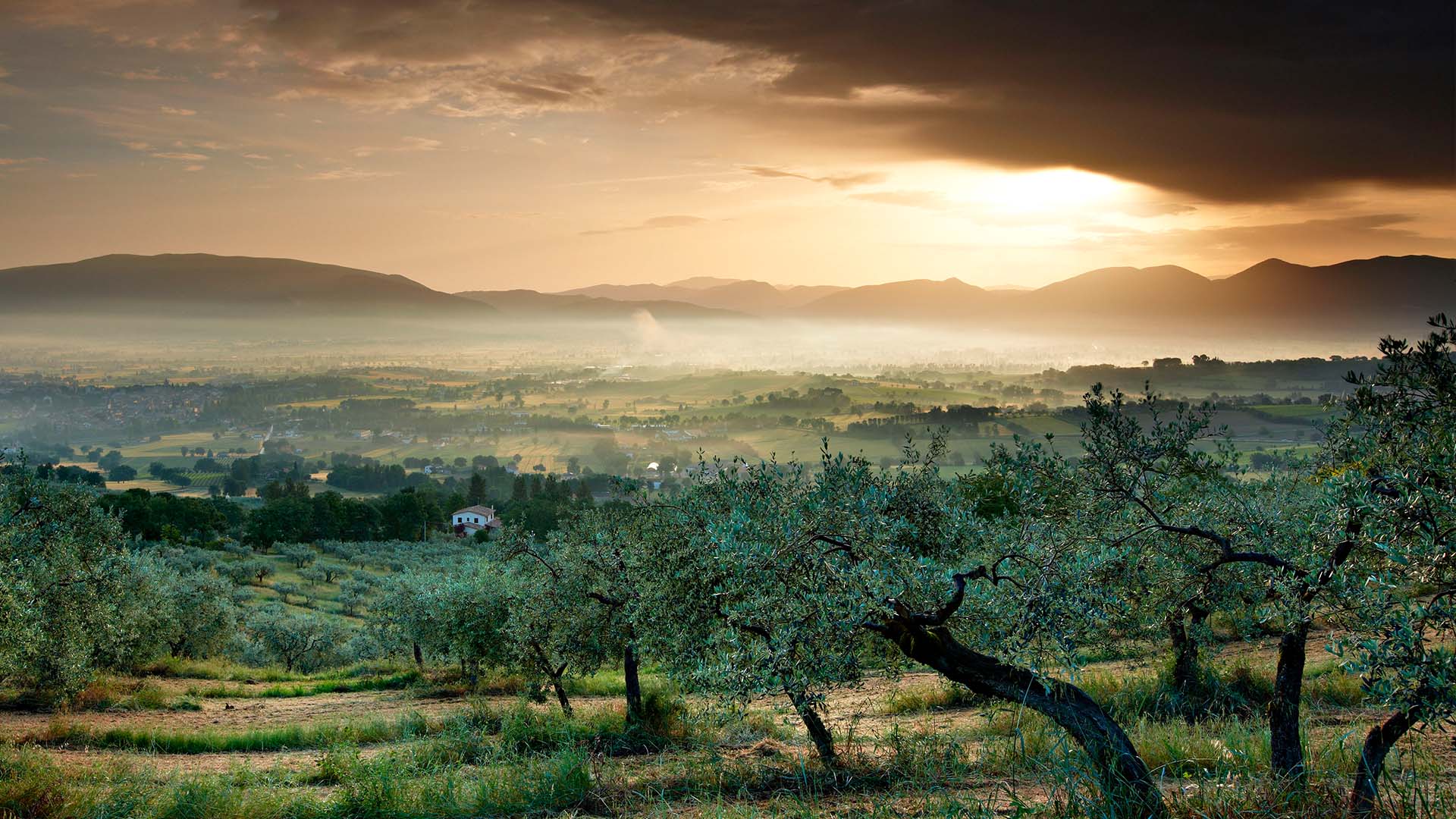 Ulivi nelle verdi colline umbre Uliveto con vista sulla valle, Bevagna (© David Noton Photography/Alamy Stock Photo)