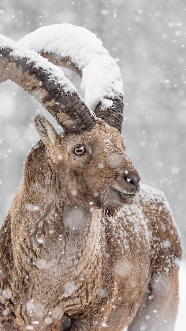 Che grandi corna congelate! Stambecco sotto una forte nevicata, Alpi, Italia (© Paolino Massimiliano Manuel/Getty Images)