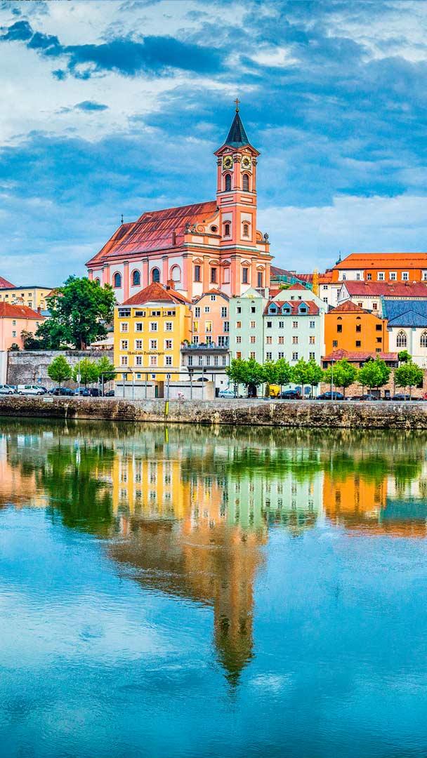 La città dei tre fiumi La città di Passavia riflessa nel Danubio, Baviera, Germania (© Scott Wilson/Alamy)