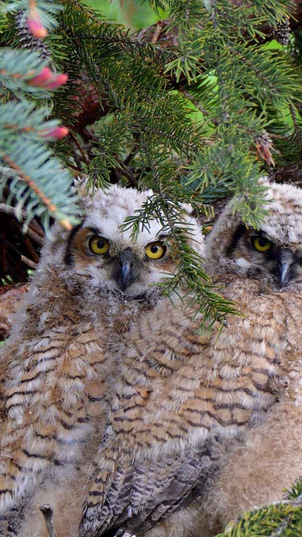 木の枝にとまるフクロウたち アメリカワシミミズク (© Michael Morse/Getty Images)