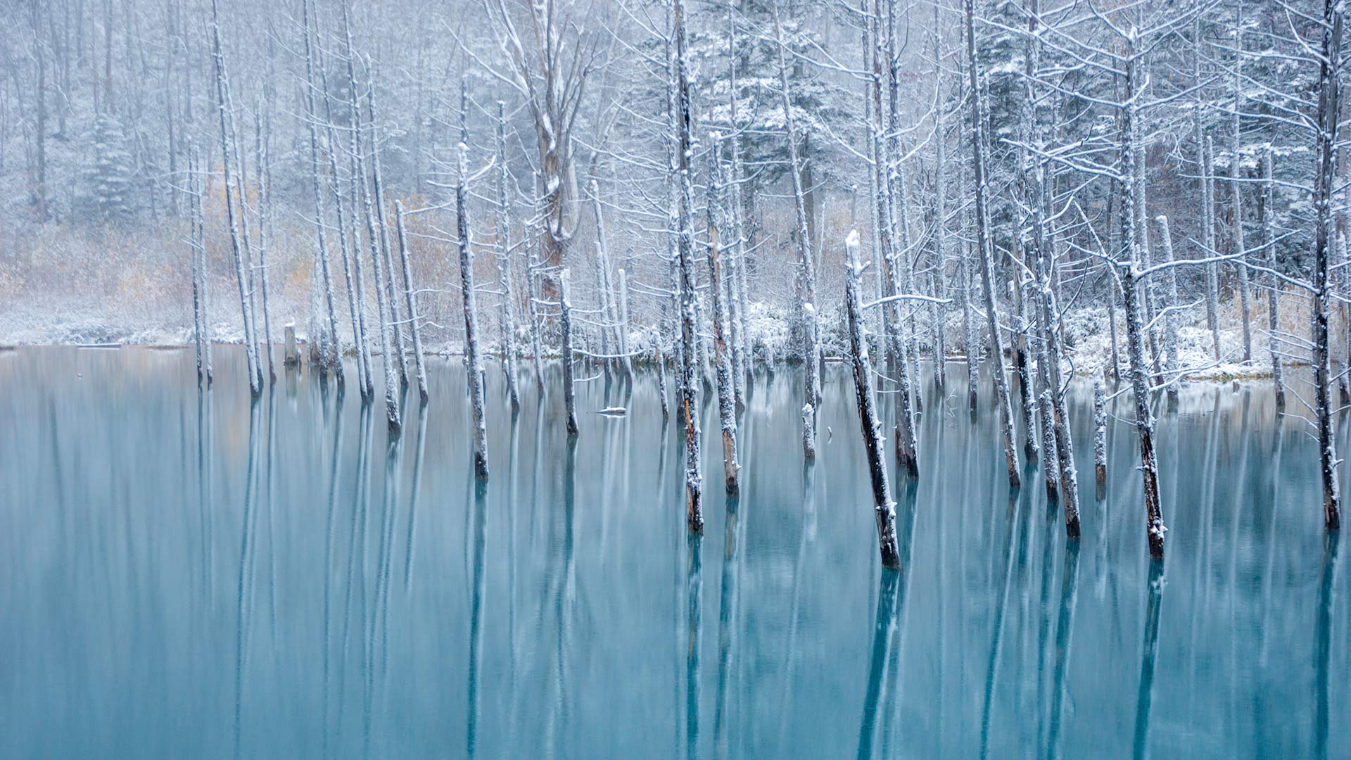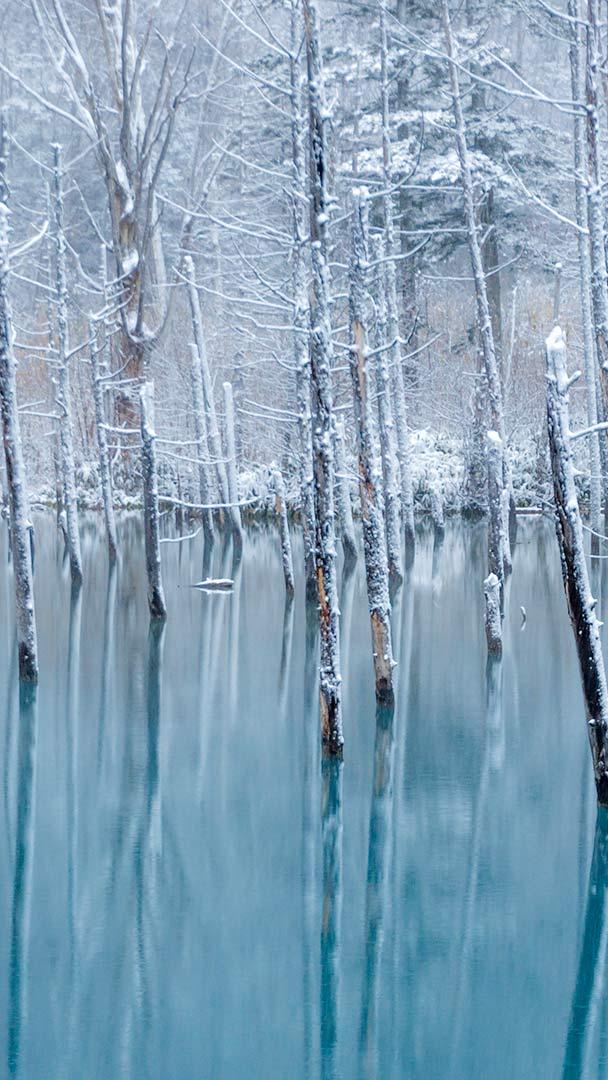 今日 12 月 22 日は冬至です。北半球では正午の太陽の高さが一年中で最も低くなる日で、昼が最も短く、夜が最も長くなります。季節の変わり目であり、寒さが一層厳しくなる時期でもあります。ここ、北海道美瑛町の「青い池」には、静かに雪が降り積もっています…