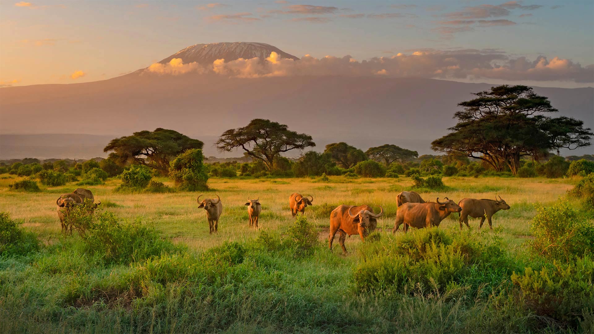 Living in harmony Mount Kilimanjaro with Cape buffalo in foreground, Amboseli Biosphere Reserve, Kenya (© RealityImages/Shutterstock)