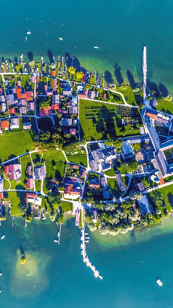 Life on the lake Aerial view of Fraueninsel island in Chiemsee, Bavaria, Germany (© Malorny/Getty Images)
