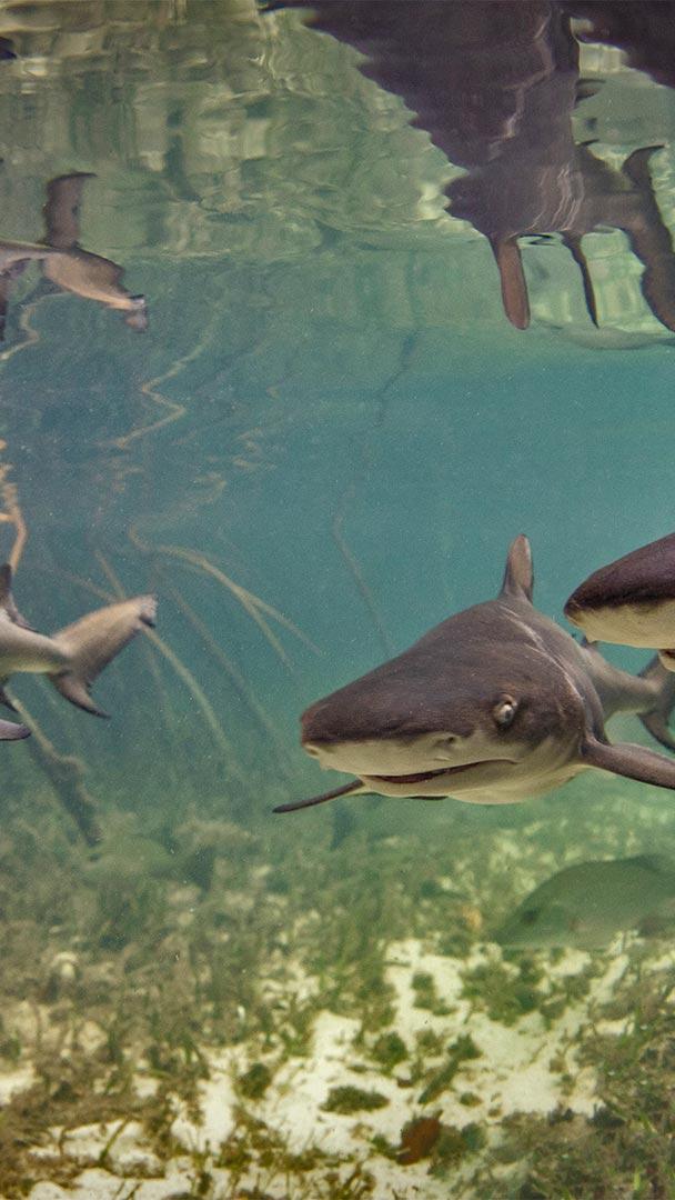 Shark Awareness Day Baby lemon sharks swimming among mangroves near Alice Town, Bimini, Bahamas (© Ken Kiefer 2/Getty Images)