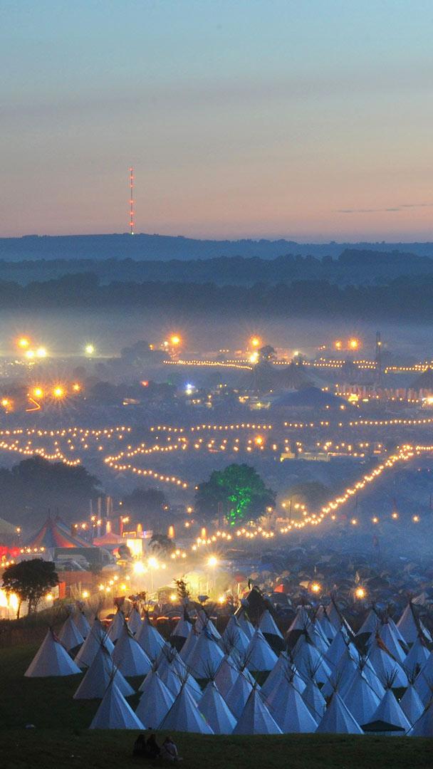 Glasto turns 50 A view of the Glastonbury Festival site from Pennard Hill, Somerset at dawn, June 2009. (© Jim Dyson/Getty Images)