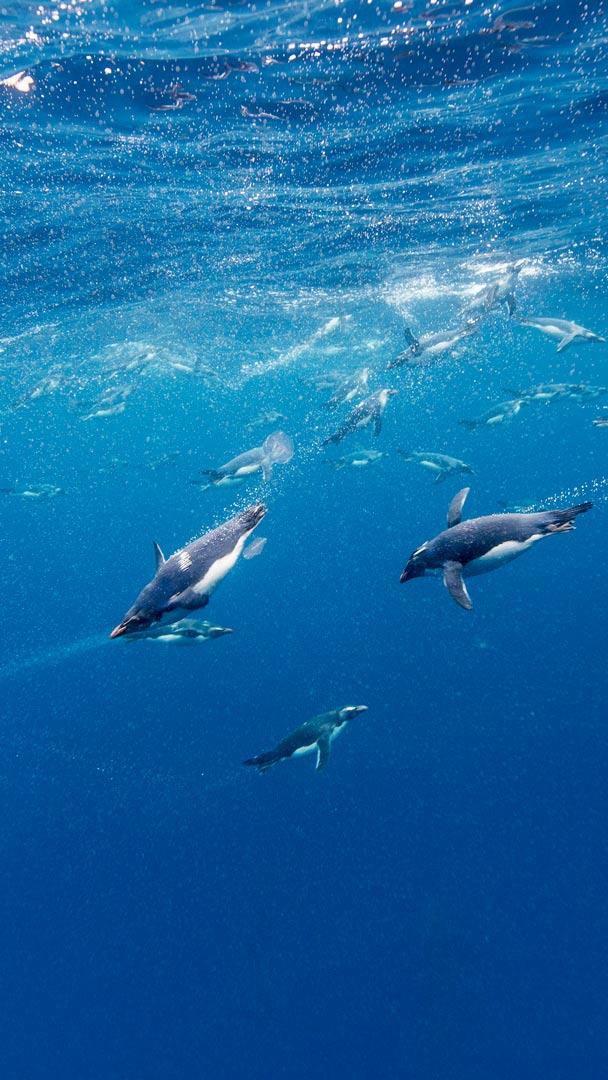 Let"s flap our flippers and take a dive into the world of penguins! How many kinds of penguins can you name? Today"s snapshot features agile macaroni penguins swimming in the plankton-rich waters of the Drake Passage in Chile. These charming creatures are just one of 18 different species of penguin found in the Southern Hemisphere and can be recognised by their peculiar amber crests and prominent orange beak. Macaroni penguins gather in foraging groups, but males can be aggressive towards each other. To show passivity and avoid a fight, individuals often ease through colonies with their heads tucked down to their chests. Despite being beloved by us humans, penguins are threatened by reduced food availability, errant fishing nets and the profound impact of climate change on their habitat, sea ice.