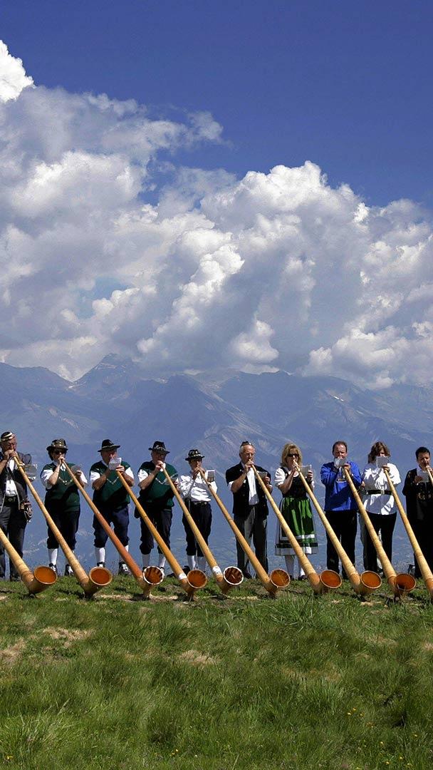 To usher in the summer music festival season, we take you to a pastoral hillside in the Swiss Alps for the International Alphorn Festival held each summer near the town of Nendaz. Musicians are gathering here this weekend to celebrate and blow these enormous traditional horns of the Alps. No one really knows the origin of the alphorn. We do know that for centuries, European mountain folks from the Alps and east to the Carpathian Mountains used this horn to signal to each other across great distances and to call in animal herds. Even though the horn has no valves or keyholes, it’s not easy to play and requires great lung power.