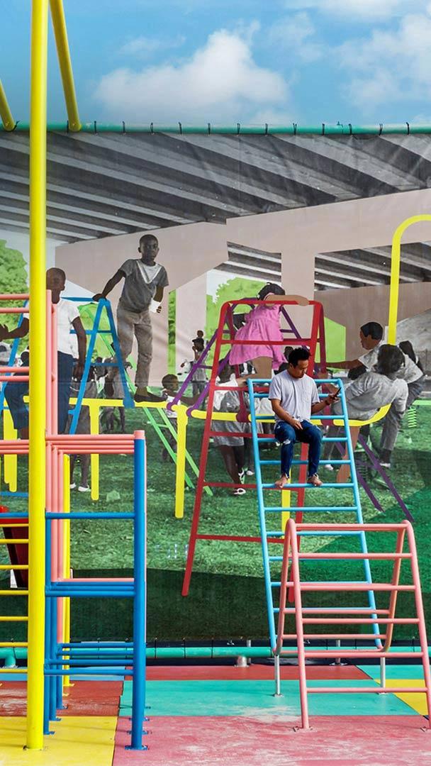 In honor of Miami Art Week, which is underway right now in Miami, we"re looking at a work called "America"s Playground" by New York-based artist Derrick Adams. The installation was featured during 2018"s Art Week and was inspired by a 1969 photo Adams found in the Black Archives at the Historic Lyric Theater in Miami. The photo shows African American children at a playground beneath a freeway in Miami’s Overtown neighborhood, a historically African American neighborhood which was nearly destroyed by highway construction in the 1960s. The construction displaced thousands of black residents from their homes, threatening the livelihood of the community. In the late 1960s, city officials and private donors pieced together funding to install a playground under the new overpass. The park was well used for a time, but due to lack of lighting and maintenance, it eventually fell into disuse.