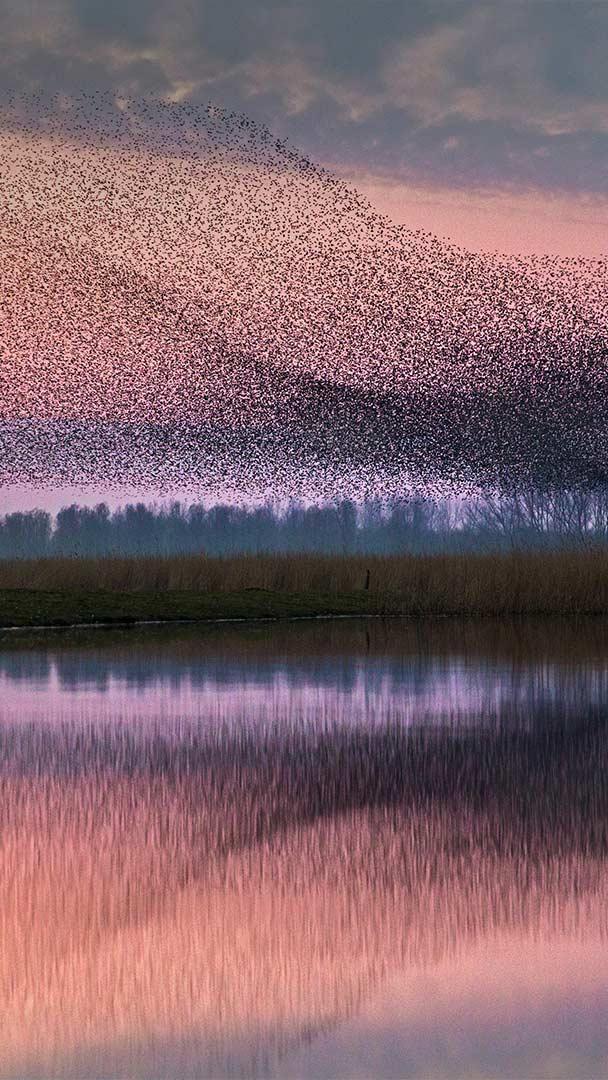 After the nesting and breeding seasons of spring and summer have passed, starlings become highly social birds, often gathering in flocks that number in the thousands. These flocks sometimes take the form of a murmuration—when the birds form a group large and dense enough that they appear to move together as a single organism, even if the movements seem arbitrary. Though scientists still don"t quite understand how the individual starlings in a murmuration coordinate their tight, fluid formations, the behavior is thought to be a way to confuse predators.