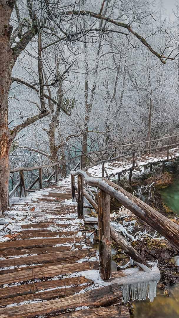 Today we"re walking out into the winter wonderland of Plitvice Lakes National Park, the oldest and largest national park in Croatia. More than a million tourists per year flock to this central mountainous region, renowned for its cascading waterfalls and 16 turquoise-colored lakes. These wooden pathways meander for miles around and above the lakes, beside waterfalls and over streams and rivers, which disappear into the moss-covered earth only to burst through again somewhere downstream. In fact, the lakes are all interconnected by underground flows and are separated from each other by natural dams of travertine.