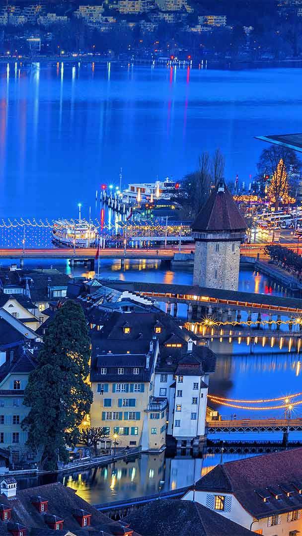 On the shores of Lake Lucerne and bestride the River Reuss, you"ll find the medieval Swiss city that shares the lake"s name. Emerging from a Benedictine monastery founded here in 750, Lucerne is today the largest town in central Switzerland. The central of three ancient, covered wooden pedestrian bridges of Lucerne"s Old Town has a unique feature. The interior of the Kapellbrücke (Chapel Bridge) is painted with religious scenes and allegories to edify those walking across it to the nearby St. Peter"s Chapel.