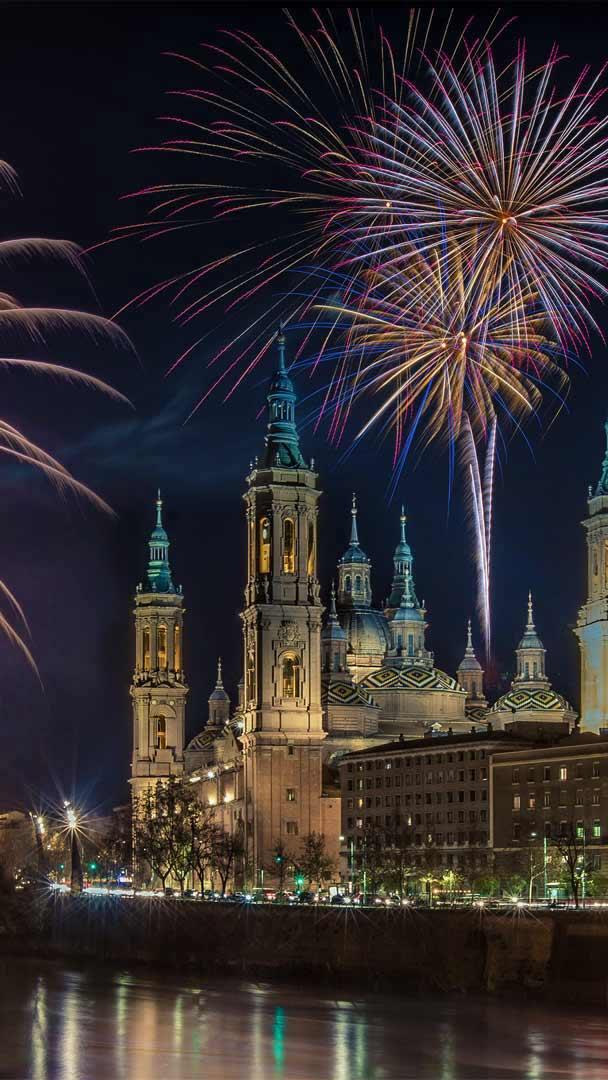 New Year"s Eve celebrations around the world will look a lot different this year, but as we ring in 2021 (and bid good riddance to 2020?) we can still enjoy this view of fireworks from a previous year in Spain. The cathedral in the background is the Basílica de Nuestra Señora del Pilar, which was constructed over centuries beginning in 1681, though several churches had been built on the site prior to that. On the left is the Puente de Piedra Bridge, which spans the Ebro River. It"s also known as the Bridge of Lions because statues of lions (symbols of the city) stand at each end of the bridge. Zaragoza is famous for its landmarks and architecture, as well as for local cuisine, and seasonal festivals—which we can only hope return soon.