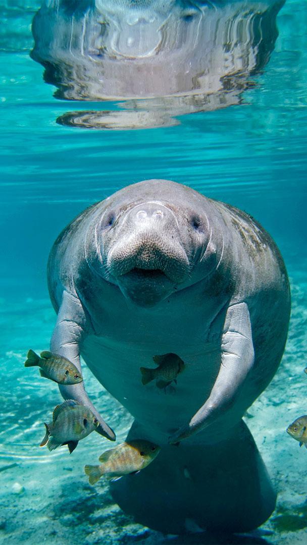 Today we wish this gentle giant of Florida"s warm waters a safe and happy Manatee Awareness Month. Closer cousins to elephants than to fellow sea mammals such as whales and dolphins, manatees follow a fully herbivorous diet of sea grasses and other marine plants—so these fish hanging out with our buddy here needn"t fear becoming a manatee"s lunch.