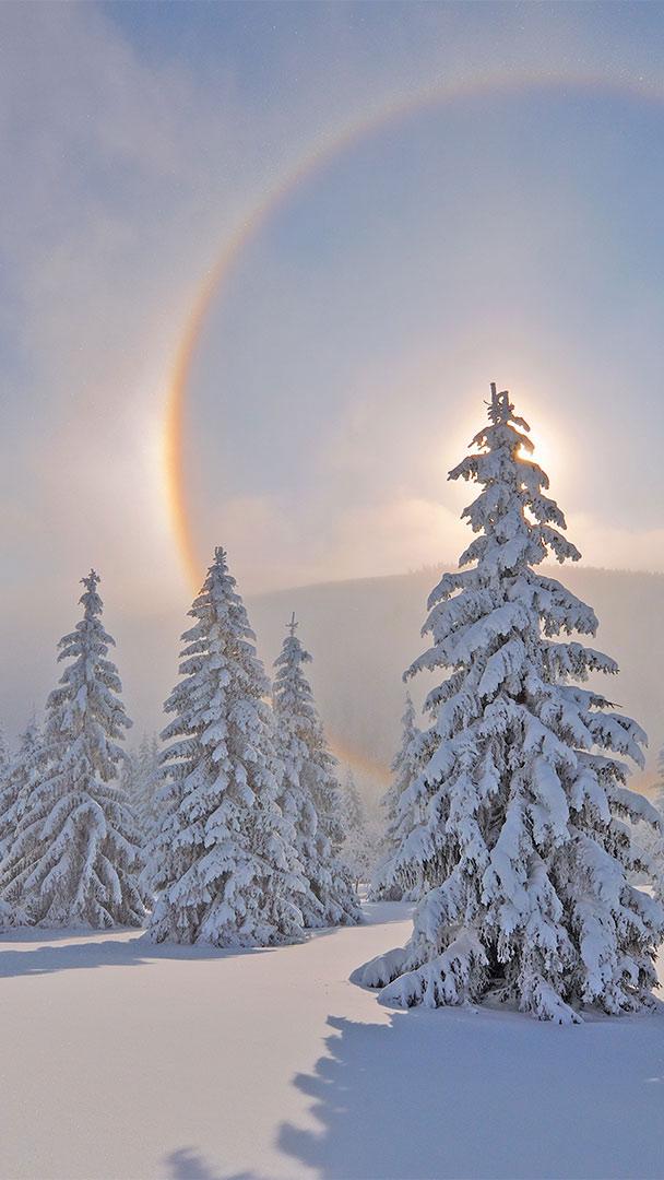 What do you call a rainbow formed by ice? An icebow, of course. Others call the phenomenon a halo, and we"ll admit it does have a mystical aura. Halos can occur when ice crystals suspended in the air refract light into a colorful ring around the bright sun. That"s what"s happening in the cold atmosphere here in the Ore Mountains along the Czech-German border. It"s a perfect complement to the snow angels you"re yearning to make in this pristine blanket of white.