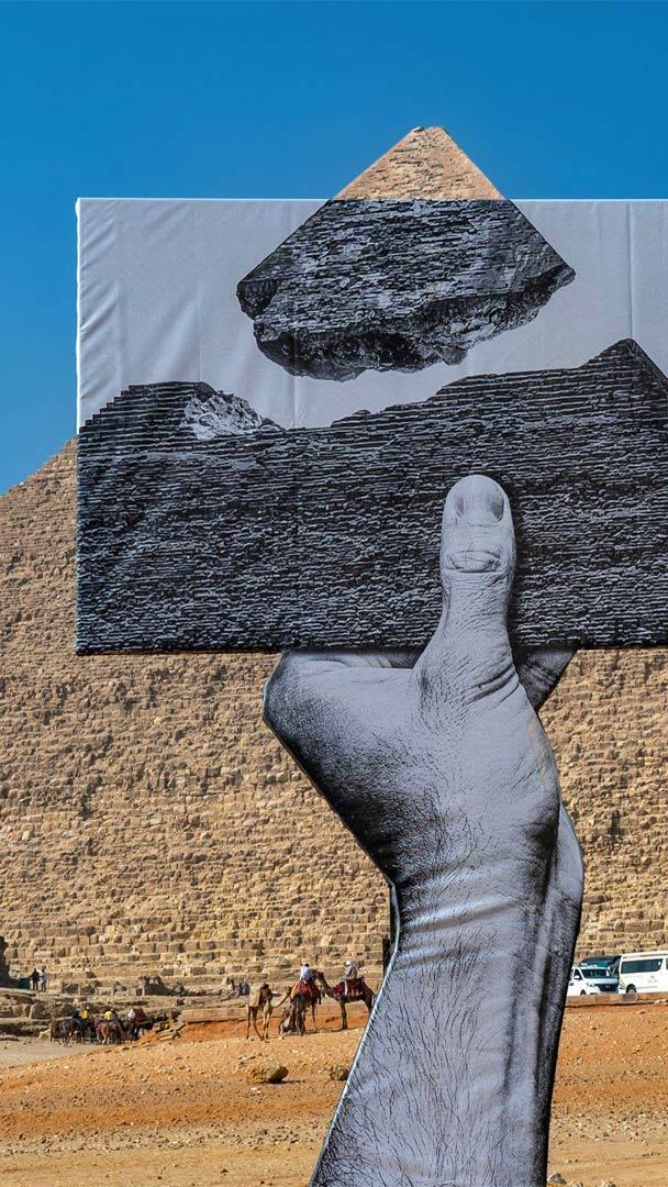 In honor of April Fools" Day, take a moment to appreciate this trick of the eye created by the French street artist and photographer who goes by the name JR. He"s known for surreptitiously posting large black-and-white photographs in public locations, often in humorous contexts. This cheeky public-art piece from 2021 was installed in the desert sands of the Giza pyramid complex in Egypt. The installation makes it look as if the detached tip of the Pyramid of Khafre magically hovers above its base.