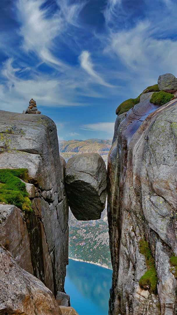 If you have nerves of steel, you"d enjoy the precarious, one-of-a-kind photo op that is the Kjeragbolten boulder. Visitors climb up Kjerag, a mountain on the southwest coast of Norway, for the chance to clamber onto the stranded rock and have their daredevil pic snapped for posterity. Indeed, Kjeragbolten is so popular that you might have to wait up to an hour for your turn—plenty of time for second thoughts and jitters.