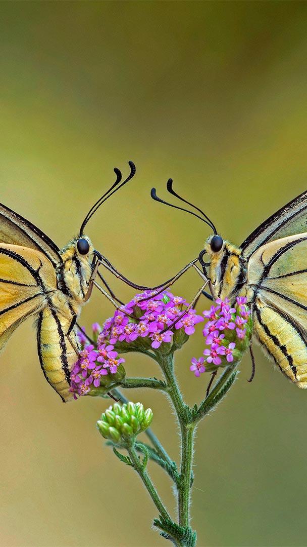 We spread our wings and fly into Pollinator Week with these exquisite Old World swallowtail butterflies who are enjoying a sip of nectar. The gorgeous swallowtail is welcome in any garden, both for its beauty and its ability to pass pollen from flower to flower. Far less desired are swallowtails in their caterpillar form, which can take a toll on ornamental plants or citrus crops. There are more than 550 swallowtail butterfly species, and their name comes from the forked appearance of their hindwings, which can be seen when the butterfly is resting with its wings spread.
