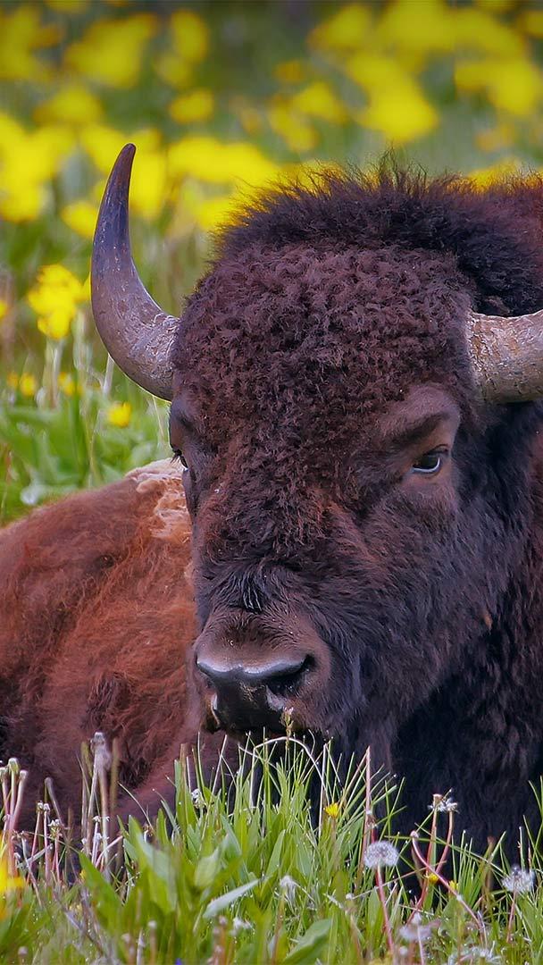 July is National Bison Month and we"ve chosen today to honor America"s official and largest land-dwelling mammal. The male American bison in today"s photo is lazing among wildflowers in Yellowstone National Park, the only place in the country where there"s been a continuous population of bison since prehistoric times. Once widespread across the American plains and revered by Native Americans, they numbered in the tens of millions. Tragically, settlers hunted the bison nearly to extinction by the late 1800s. Fewer than 1,000 of the giants were left in 1905 when the American Bison Society was formed to save them. These days, the population has stabilized with a little more than half a million bison spread across the country, with a few thousand living freely on the plains at Yellowstone.