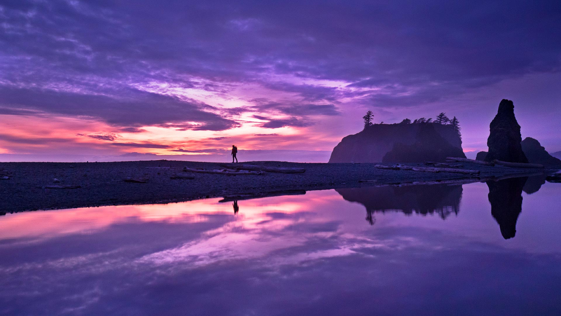The final day of National Park Week brings us to Ruby Beach, a coastal destination named for its sparkly sand, at Washington’s Olympic National Park. Here on the Olympic Peninsula you’ll find rugged beaches, glacier-topped mountains, and temperate rainforests that receive upwards of 12 feet of rainfall per year. All that rain feeds the mosses, lichens, and ferns that lend the forests a unique, jungle-like quality. Thanks for exploring national parks with us for the past week–it’s been fun!