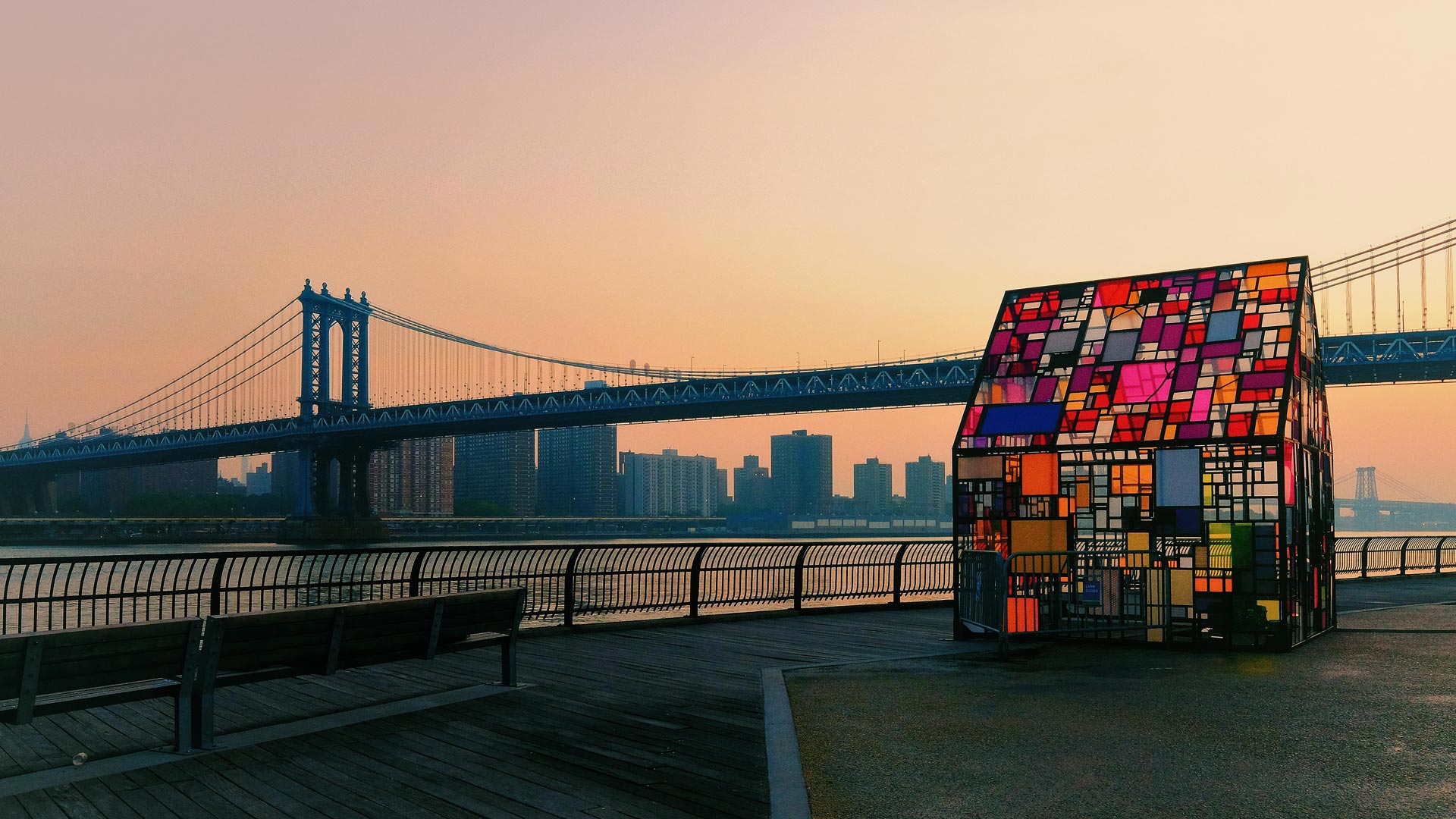 ‘Kolonihavehus, 2010’ is a public artwork in Brooklyn Bridge Park, across the East River from Manhattan. The piece is made of scrap Plexiglas that artist Tom Fruin salvaged locally. The park’s 85 acres reclaimed and revitalized a stretch of Brooklyn’s East River bank, with sweeping views of Manhattan, just across the water.