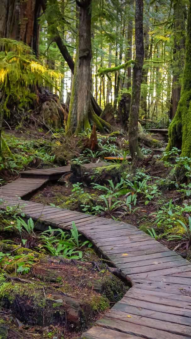 Discover the beauty of Vancouver Island, Canada. The wooden pathway in today"s image, surrounded by ancient pine and cedar trees, leads to Kennedy Lake, the largest freshwater body on the island. The lake covers a surface area of 16,000 acres. It is part of the ancestral lands of the Tla-o-qui-aht First Nation where the Clayoquot and Kennedy Rivers meet. Tofino, over 24 miles away, has a real surf vibe. This small coastal town is a sanctuary for hikers, bird watchers, artists, and dreamers. Famous for its mild winters and pleasant summers, it has been a filming location for movies like "The Twilight Saga: New Moon" and "One Week."