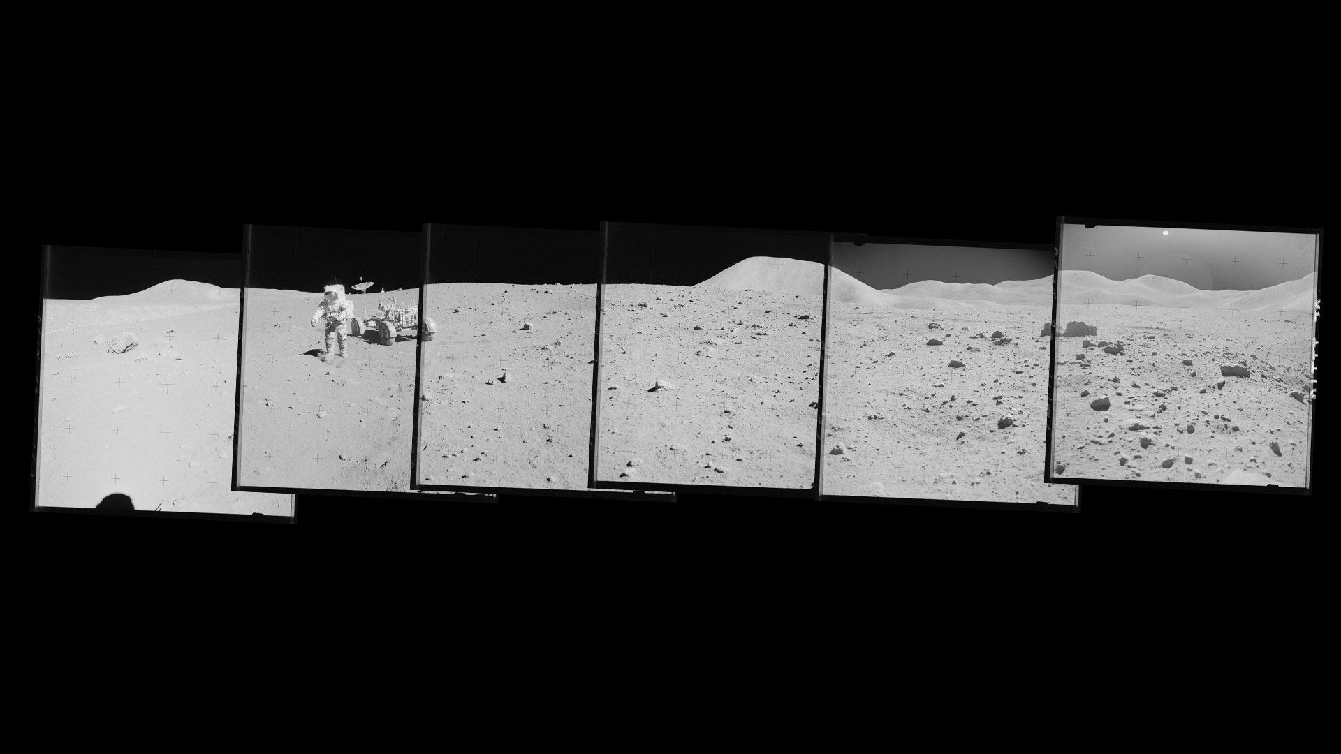 Today is National Moon Day, commemorating the day in 1969 that Neil Armstrong was the first person to set foot on the moon. Eleven other astronauts have gone on to follow in his bootsteps, including Commander David Scott and Lunar Module Pilot James Irwin, who took these historic photos during the Apollo 15 moon mission in 1971. We’ve stitched together their images to create this composite panorama of the landing site, where they spent three days conducting research. (If only they had selfie sticks back then.) Look for the ‘play’ button on our homepage to hear actual transmissions between the crew and the Mission Control Center in Houston.