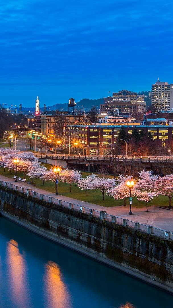 Cherry blossoms at Tom McCall Waterfront Park, Portland, Oregon © Eric Vogt/Tandem Stills + Motion